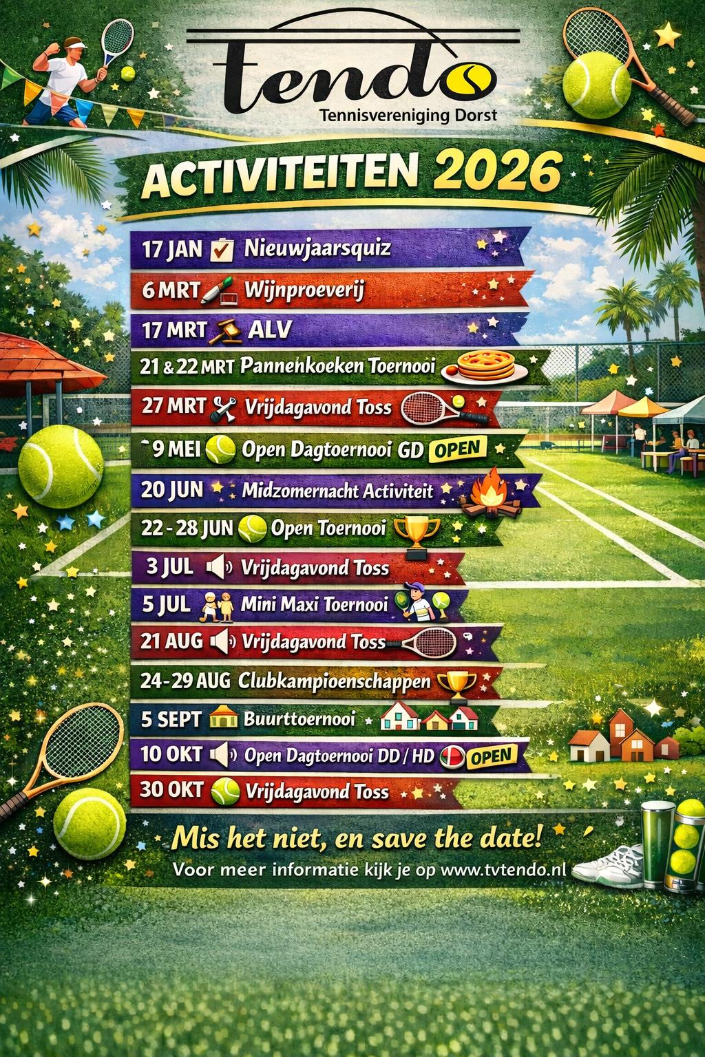 Bij TV Tendo draait het om méér dan alleen tennis. Het hele jaar door organiseren we activiteiten die zorgen voor sport, plezier, ontmoeting en verbondenheid. Of je nu lid bent, jeugdspeler, dorpsgenoot of sponsor: er is altijd iets te beleven op ons park.
